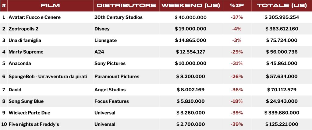 Tuttavia, non sono solo i Na’vi a dominare il box-office. Zootropolis 2 continua a soprendere: sono 19 i milioni incassati nel mercato statunitense, con un calo minimo del 4.5% e un totale salito a quota 363 milioni. Il film ottiene il settimo migliore sesto weekend di sempre e il secondo per un film d’animazione, dopo Frozen (2013).