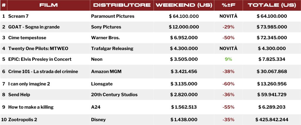 A trionfare nel weekend è stato Scream 7, con un esordio da 64.1 milioni di dollari nel solo mercato statunitense. Il settimo capitolo della saga slasher ha superato ogni previsione: è il migliore esordio di sempre per un film del franchise, superando il precedente record di Scream 6 (44.4 milioni nel 2023). Il film è inoltre l’ottavo migliore esordio per un film horror negli Stati Uniti ed il quarto se si considera solo il periodo post-pandemico.