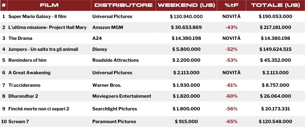 Nel fine settimana pasquale, il dominio di Mario non ha però oscurato del tutto i titoli in tenitura o le altre novità della settimana. Al secondo ed al terzo posto troviamo rispettivamente L’ultima missione: Project Hail Mary e il nuovo film A24 The Drama.