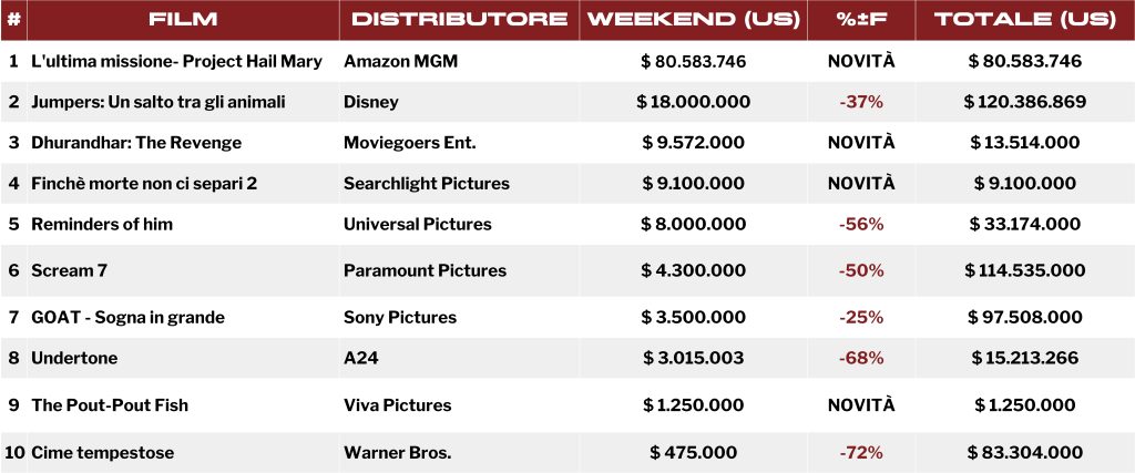 L’ultima missione: Project Hail Mary sorprende il botteghino mondiale con oltre 140 milioni di dollari nel primo weekend di programmazione. Per Amazon, che, nel 2021 acquistò la Metro-Goldwyn-Mayer per 8.45 miliardi, è il migliore esordio di sempre superando il precedente record detenuto da Creed III (100.4 milioni nel 2023). Il nuovo film di Phil Lord e Chris Miller con Ryan Gosling, adattamento del romanzo scritto da Andy Weir, è solo l’ultimo di una lunga serie di film che ha esordito ben oltre le aspettative grazie all’ottimo passaparola (A al Cinemascore).