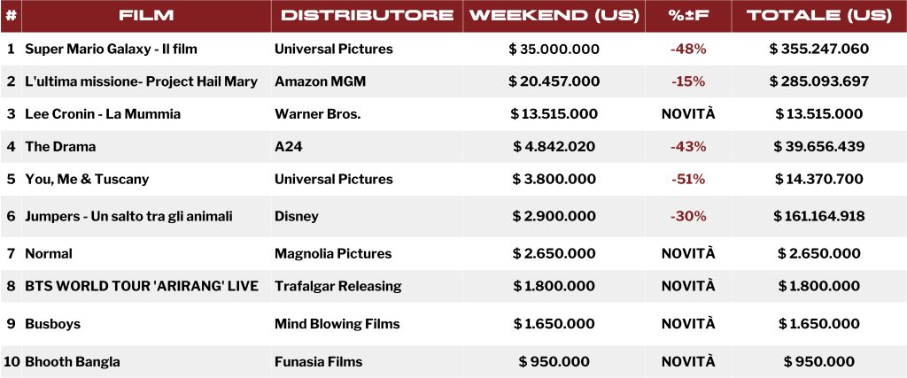Negli Stati Uniti, Super Mario Galaxy ha mantenuto la prima posizione con un incasso di 35 milioni di dollari, in calo del 49% rispetto allo scorso fine settimana. Il totale sale a quota 355.2 milioni, confermando l’enorme successo del franchise, ma aumentando il gap con Super Mario Bros. – Il Film che, nello stesso periodo di programmazione, era calato del 35% per un totale di 436 milioni.