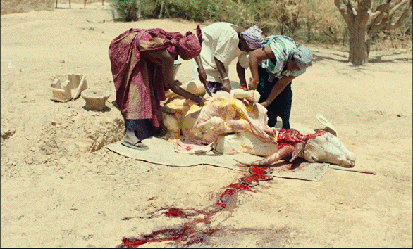 La scena è lontana dal tradizionale cinema romantico coloniale, in quanto la macchina da presa non teme di mostrarci l’atto viscerale di squarciare il collo di una mucca. Questo costringe sia gli spettatori locali che stranieri a partecipare (con disagio) a un tributo, mentre assistiamo alla feroce imposizione del potere su un corpo incapace di sfuggire al suo destino. Man mano che la siccità si protrae, il bestiame collassa lentamente e si riduce a un insieme di creature impotenti, consumate dal loro ambiente spietato. La moltitudine di corpi, sparsi su un terreno arido, mirano anch’essi a un processo collettivo di disumanizzazione. Avendo come punto di partenza il totale disprezzo per l’uso di risorse redditizie locali, il Senegal è stato poi ridotto a uno spazio commerciale per le forze coloniali francesi che, prima della fine del XIX secolo, consideravano superflui i rapporti con la popolazione. Pertanto, le carcasse che non vengono mai rimosse o smaltite dalla periferia del villaggio (venendo invece trascurate), rappresentano il disprezzo per le risorse immateriali e inadeguate da parte di uomini la cui coscienza è puramente orientata verso il profitto tangibile. Certamente, si tratta di una lettura estremista; la Sy presenta in effetti rappresentazioni grafiche di vite vittimizzate come mezzo per democratizzare la brutalità che, sebbene non universale, dovrebbe essere compresa o affrontata da tutti.
