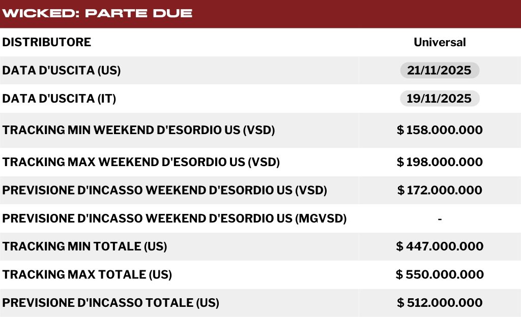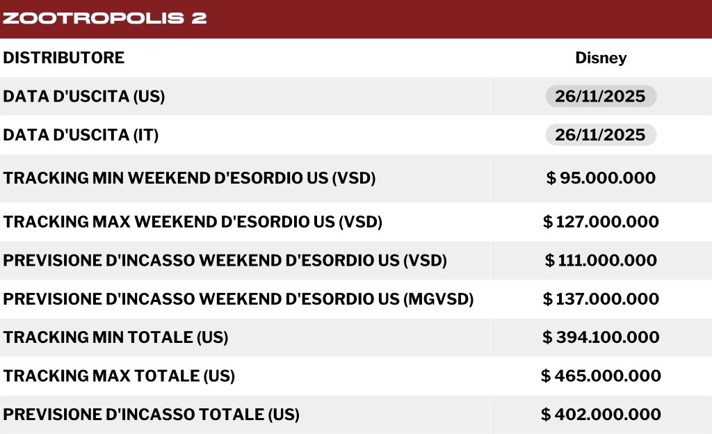 Le prevendite di Zootropolis 2 spingono a rivedere (momentaneamente) le previsioni al ribasso: il film perde terreno nel confronto a distanza con Oceania 2. Complice la Wicked-mania, che sta catalizzando l’attenzione di quel target di pubblico. Le prospettive però, restano positive: la tendenza potrebbe rapidamente invertirsi con l’avvicinarsi dell’uscita del musical di casa Universal. Non è da escludere, tuttavia, che i due titoli finiscano per dividersi i mercati, con Wicked: Parte Due destinato a dominare il mercato statunitense, mentre il nuovo Classico Disney potrebbe rivelarsi più competitivo a livello internazionale.